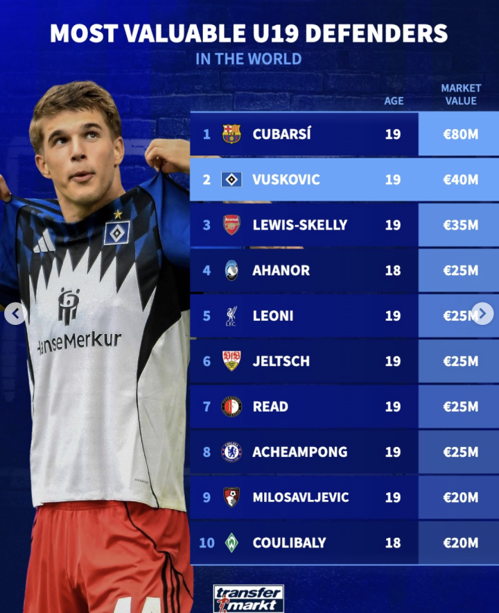 虎扑03月17日讯德转统计了足坛U19后卫身价榜。