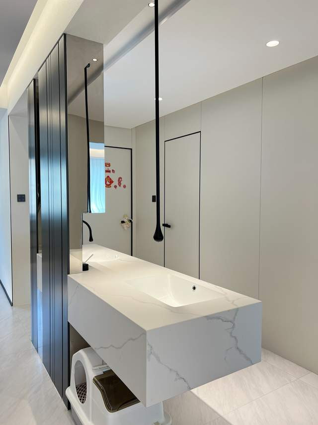 空间合座以温润的浅米色手脚墙面主色调,温存的质感弱化了空间的硬朗感,搭配浅灰色大理石纹理的大地瓷砖,让合座色结伴谐合并,尽显检朴大气的作风。洗手台区域是空间的视觉中枢,悬浮式缠绵的岩板洗手台连接了大理石的当然纹理,波音体育官方网站空洞的纹路为空间增添了良好感,台下盆的缠绵不仅清洁起来更为浅近,也让台面显得干净利落。