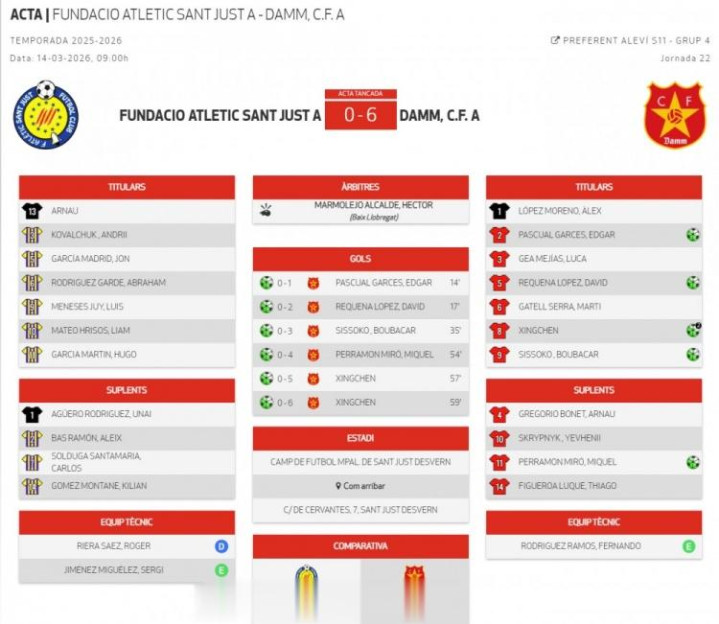 直播吧3月16日讯据博主“稀盐酸青训频谈”报谈,在西班牙加泰罗尼亚大区U11优选联赛中,中国球员金星辰梅开二度。