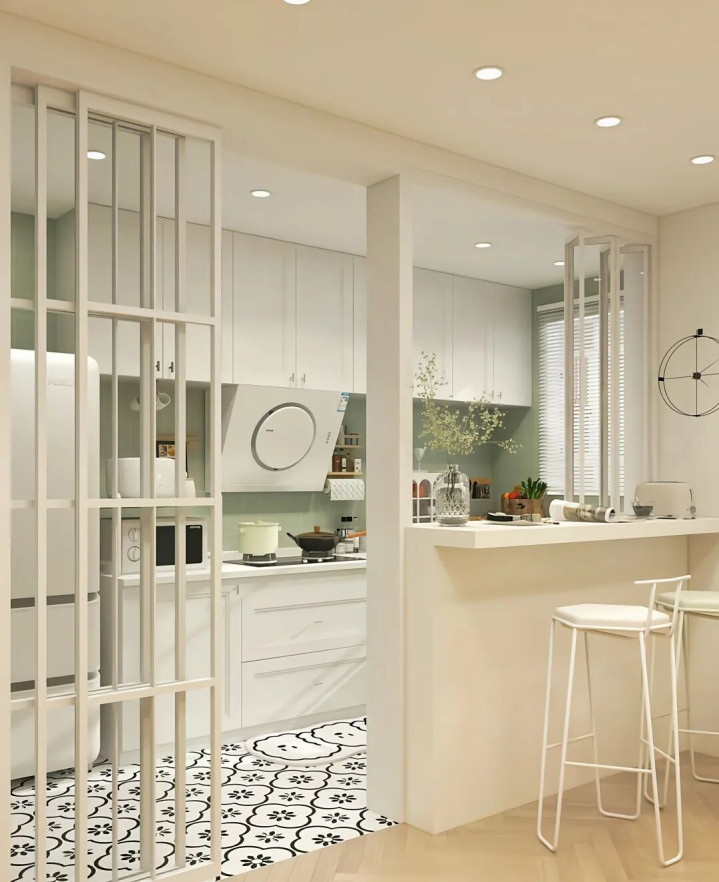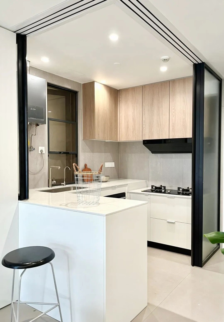 我们可以把厨房两面墙作念成透明的玻璃——一边装口袋门,另一边作念成“下柜上台”的想象。
