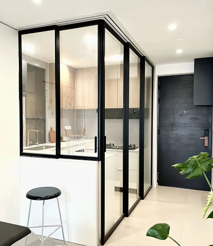但其实,我们可以罗致“玻璃墙+岛台”的想象,这么既能结束敞开,又不会影响油烟的界限。