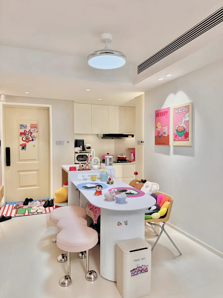 莫得餐桌的想象让空间更开脱,不仅宽敞,还能收纳各式杂物,实用性满分。