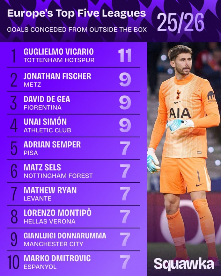 直播吧3月17日讯Squawka统计了本赛季门将在五大联赛禁区外失球的数目,并排出榜单,ag真人app官方网站下载维卡里奥11球最多。