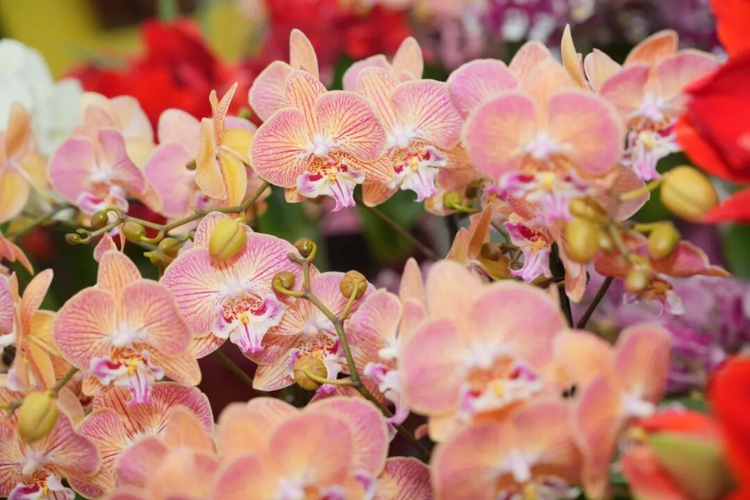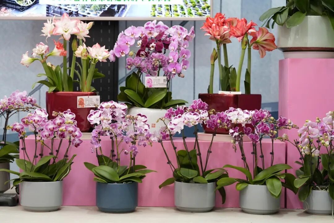 相邻展位上,数十盆蝴蝶兰姿态优雅,纯白、浅粉、紫斑等花色错杂散布,肥厚的叶片泛着油亮精辟,花茎挺拔朝上,犹如轻歌曼舞的仙子,与朱顶红的浓烈造成私密呼应。
